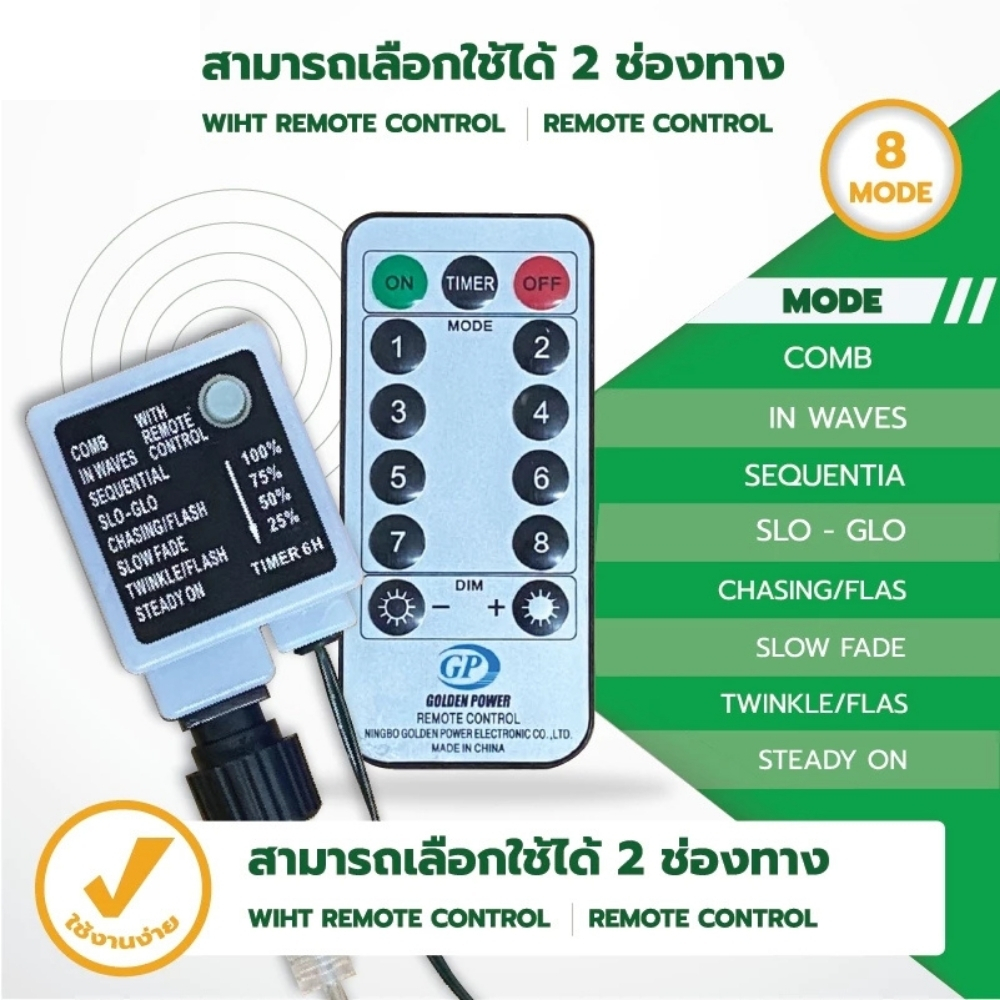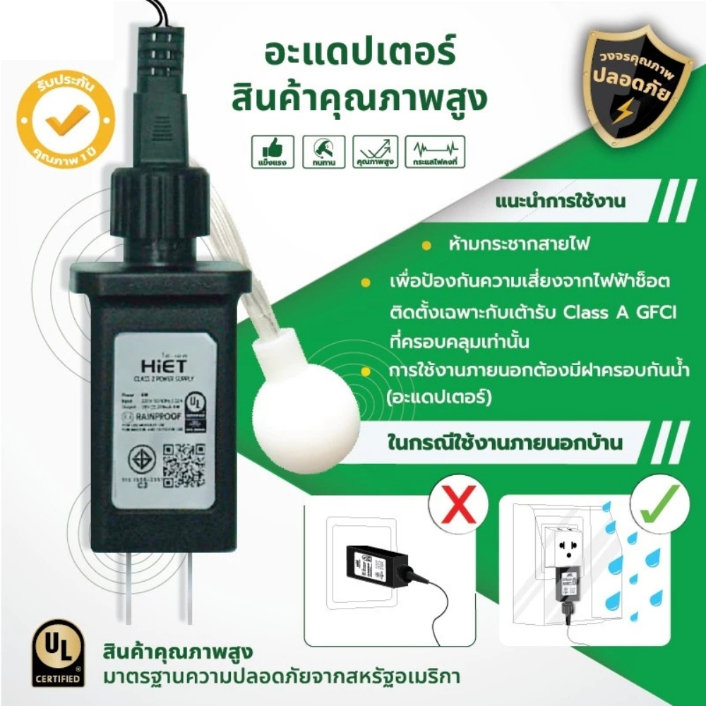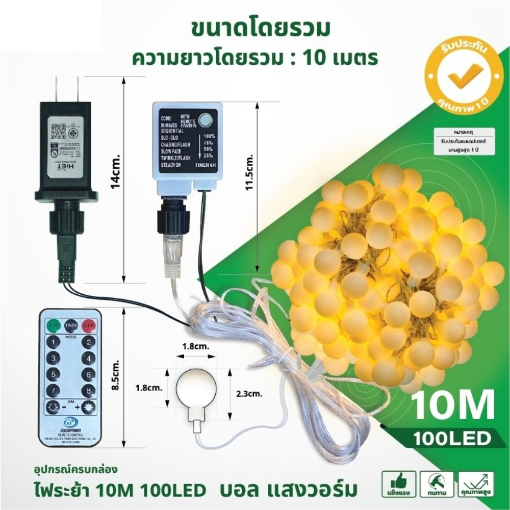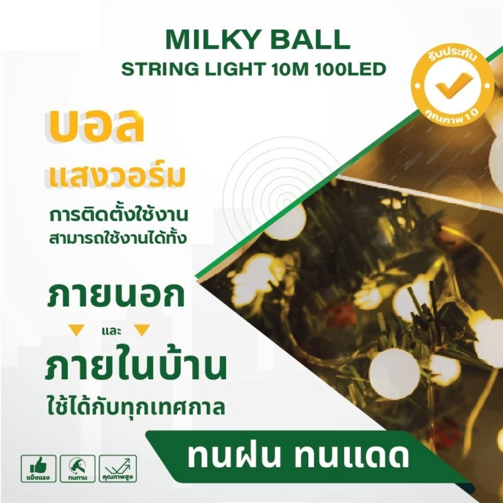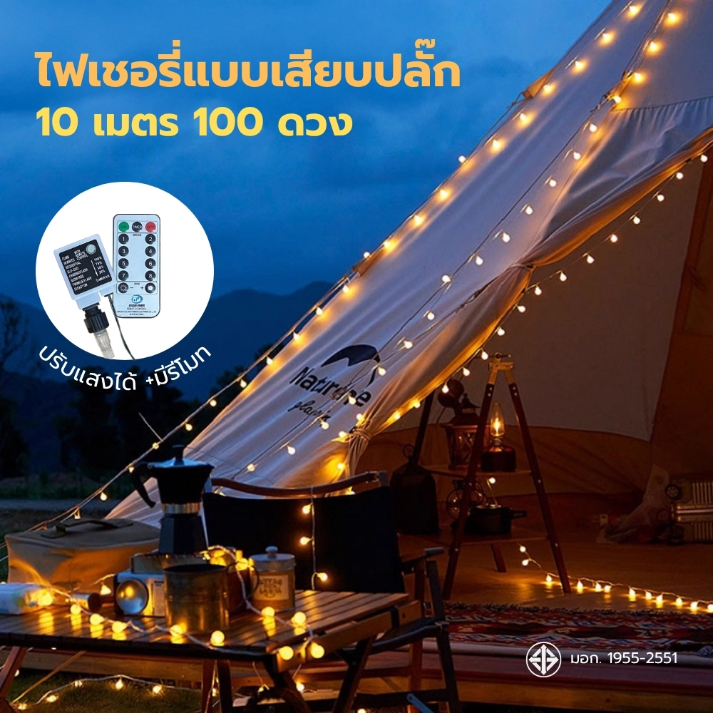 ไฟเชอรี่ ไฟประดับ-ตกแต่งสถานที่ แบบเสียบปลั๊ก หลอดไฟ LED แบบขุ่นให้แสงสวยงาม ปรับโหมดการใช้งานได้ 8 แบบ โหมดไฟสว่างตลอดเวลา, โหมดไฟกระพริบช้า-เร็ว พร้อมรีโมทควบคุม คุณสมบัติ - ไฟ LED 100 ดวง, ความยาว 10 เมตร - แบบเสียบปลั๊ก อะแดปเตอร์อย่างดี มาตรฐาน UL - มีกล่องควบคุมพร้อมรีโมท - ปรับโหมดการใช้งานได้ 8 แบบ, เปิดไฟสว่าง กระพริบช้า-เร็วได้ - กันน้ำระดับ IP65 - แสงวอร์มไวท์ แสงสีเหลืองนวลสวยงาม - ได้มาตรฐาน มอก.1955-2551 - รับประกันอะแดปเตอร์นานสูงสุด 1 ปี ข้อแนะนำการใช้งาน - ห้ามกระชากสายไฟ - เพื่อป้องกันความเสี่ยงจากไฟฟ้าช็อต ติดตั้งเฉพาะกับเต้ารับ Class A GFCI ที่ครอบคลุมเท่านั้น - การใช้งานภาพนอกต้องมีฝ่ครอบกันน้ำ (อะแดปเตอร์) #ไฟเชอรี่ #ไฟเชอรี่LED #ไฟประดับตกแต่ง #ไฟกระพริบ #ไฟคริสมาสต์ #ไฟตกแต่ง #ไฟแต่งบ้าน #ไฟปีใหม่ #ไฟแต่งเต็นท์ #StringLightMilkyBall