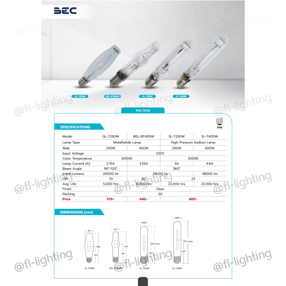 *สั่งซื้อปริมาณมากกรุณาติดต่อฝ่ายขาย LINE : @fl-lighting คุณสมบัติ - หลอดเมทัลฮาไลด์ ขนาด 400 วัตต์ รุ่น BGL-BT400W - ขนาด : 60 x 265 x 265 มิลลิเมตร