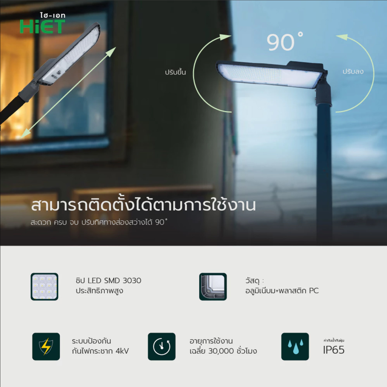 โคมไฟถนนประสิทธิภาพสูง ติดตั้งง่าย รองรับการติดตั้งได้ทั้งแนวตั้งและแนวนอน