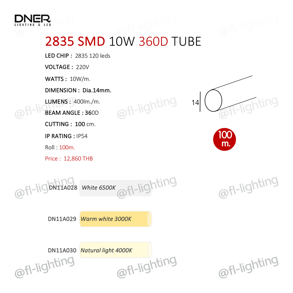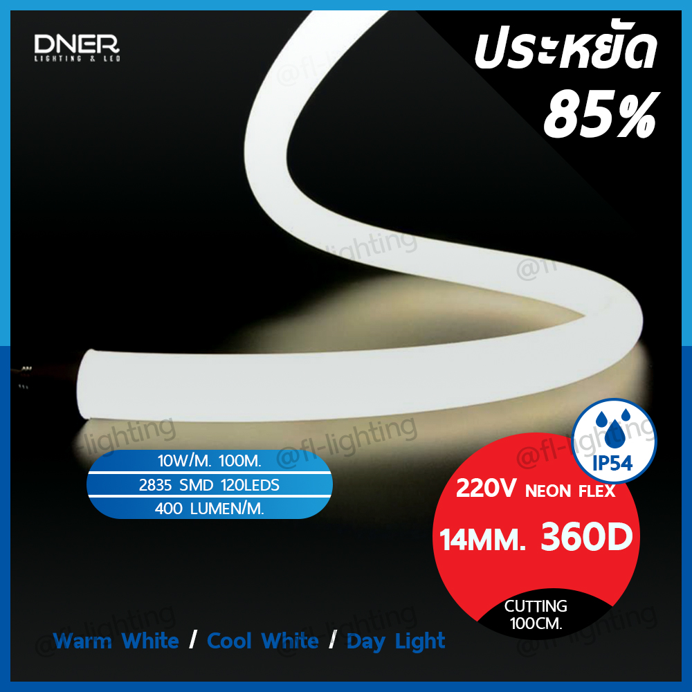*สั่งซื้อปริมาณมากกรุณาติดต่อฝ่ายขาย LINE : @fl-lighting คุณสมบัติ - NEON FLEX TUBE 360D 14MM. 220V 2835 SMD 120LEDS - ขนาด 14 มม. ความยาว 100 เมตร - ระยะตัดทุกๆ 100 ซม. - ความสว่าง 400 ลูเมน/เมตร - กันน้ำกันฝุ่นระดับIP54 - แสงวอร์มไวท์ ( แสงเหลือง ) - แสงคูลไวท์ ( แสงขาวอมเหลือง ) - แสงเดย์ไลท์ ( แสงขาว ) #Dner #NeonFlex #ไฟเส้น #ไฟสายยาง #นีออนเฟล็ก #นีออน #LED #นีออนเฟล็กกลม #Neon #CoolWhite