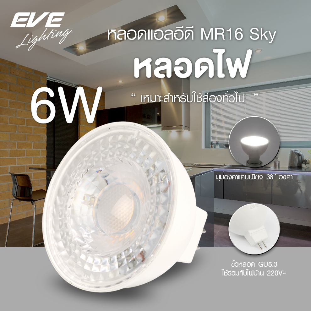 หลอดแอลอีดี MR16 Sky ขนาด 6 วัตต์ สำหรับใช้ร่วมกับไฟบ้าน 220 โวลต์ เหมาะสำหรับใช้ส่องทั่วไป เช่น ออฟฟิศ สำนักงาน ห้างสรรพสินค้า คอนโด อพาร์ทเม้นท์ หลอดไฟให้ค่ามุมกระจายแสง (Beam Angle) 36 ํ ให้ลำแสงเย็น ไม่ทำให้สีซีดจาง ไม่ทำลายจุดที่แสงส่อง