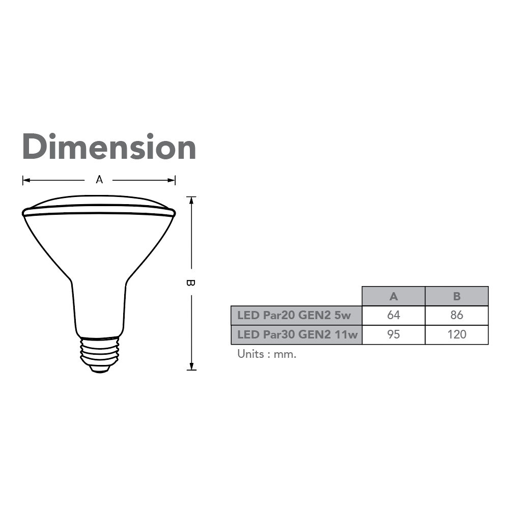 หลอดแอลอีดี พาร์ ขนาด 5 และ 11 วัตต์ ใช้เน้นการให้แสงบางบริเวณ บางจุด เพื่อส่องให้บริเวณนั้นดูโดดเด่น เหมาะสำหรับใช้ส่องสถานที่ทั่วไป สวนหย่อม สวนอาหาร หลอดไฟให้ค่ามุมกระจายแสง (Beam Angle) 38 ํ