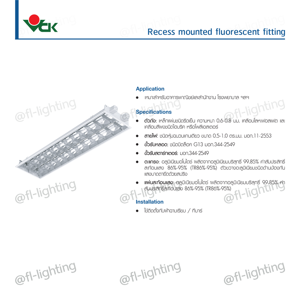 - ตะแกรง : อลูมิเนียมอโนไดซ์ ผลิตจากอลูมิเนียมบริสุทธิ์ 99.85% ค่าสัมประสิทธิ์สะท้อนแสง 86%-95% (TR86%-95%) ตัวขวางอะลูมิเนียมชนิดด้านป้องกันแสงบาดตายึดด้วยสปริง